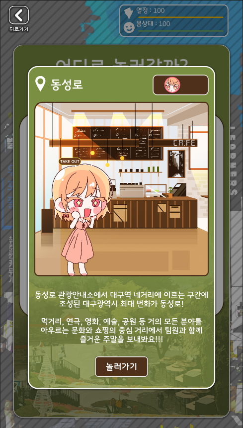 각 장소에 출몰한 민하와 다른 팀원들과 함께 외출하는 시스템입니다.